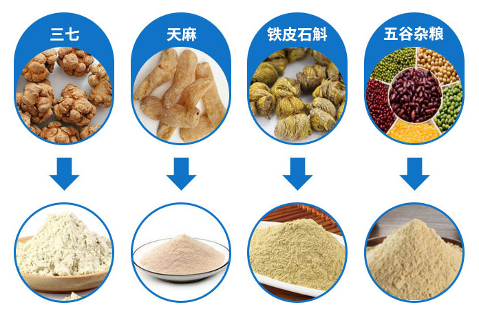 高效快速粉碎各种软硬药材和其他材质的物料,主要包括灵芝、西洋参、玛卡、铁皮枫斗、三七、珍珠、茎草类、矿石类、混合中药材、五谷杂粮、干燥的草本植物等(油性、湿性、粘性物料除外)。