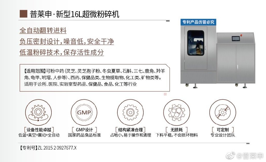 2、真空 普莱申粉碎过程采用真空环境,中药环境安全卫生
