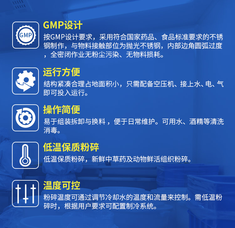 磨筒的夹套通入冷却水。通过调节冷却水的温度和流量可控制粉碎温度。低温粉碎,制冷温度可达-35℃(高档低温配置)。