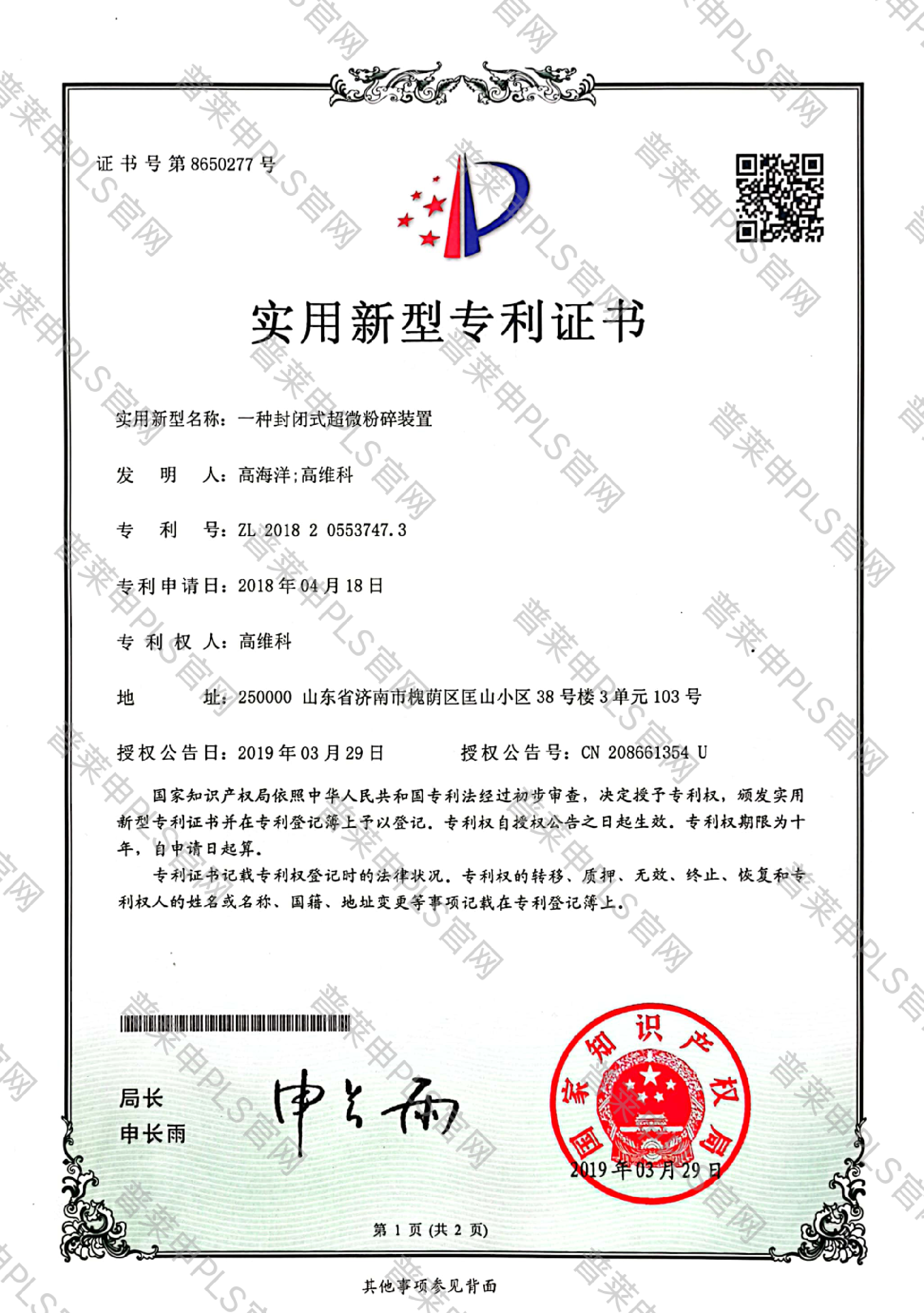(2019) 一种封闭式超微粉碎装置实用新型专利