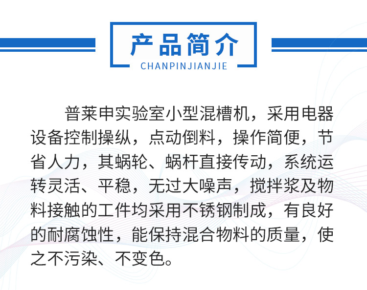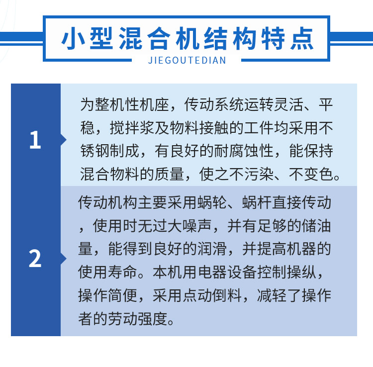 1、为整机性机座,传动系统运转灵活、平稳,搅拌浆及物料接触的工件均采用不锈钢制成,有良好的耐腐蚀性,能保持混合物料的质量,使之不污染、不变色。