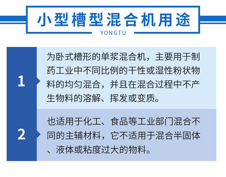 1、为卧式槽形的单浆混合机,主要用于制药工业中不同比例的干性或湿性粉状物料的均匀混合,并且在混合过程中不产生物料的溶解、挥发或变质。